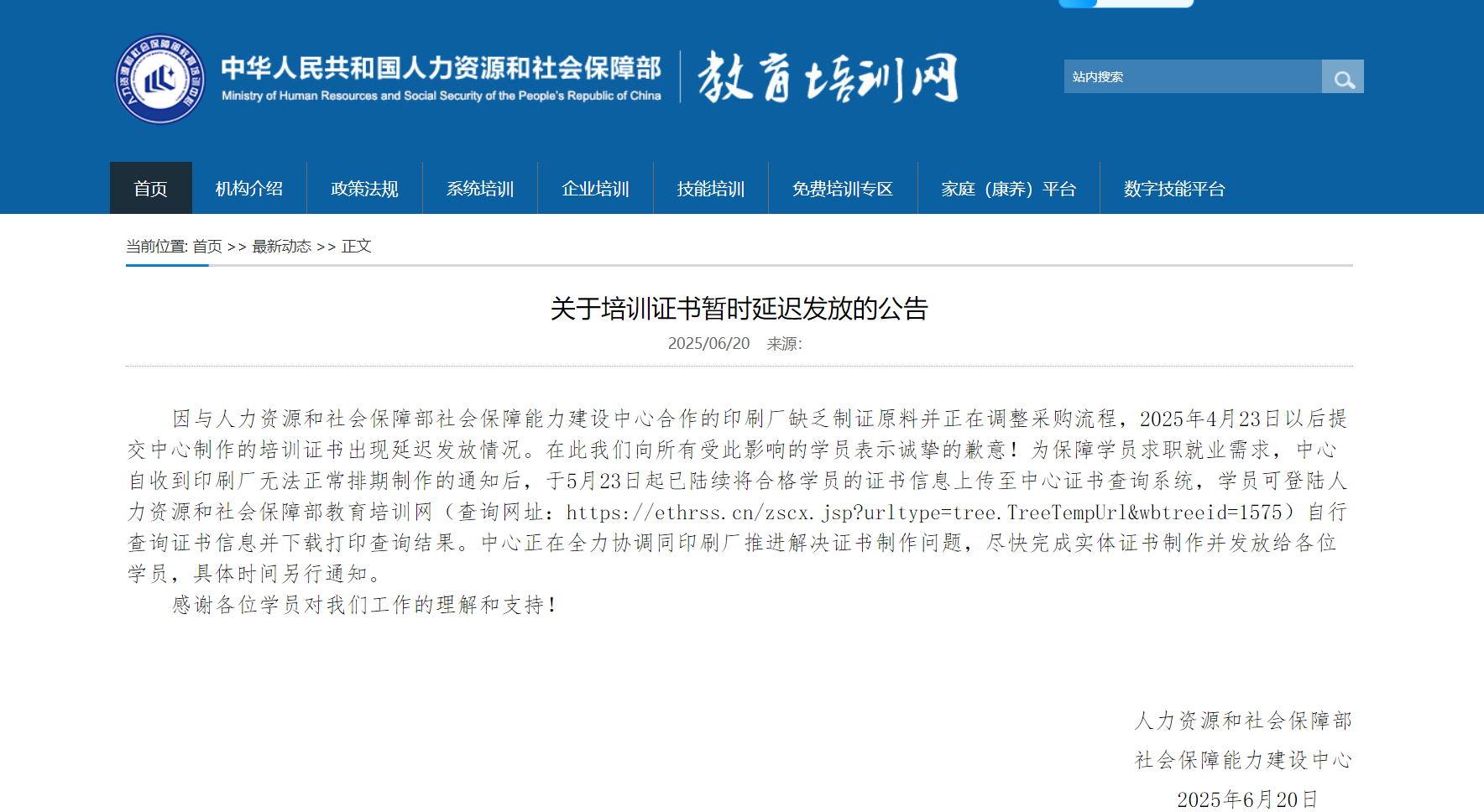 因人力资源和社会保障部社会保障能力建设中心合作的印刷厂缺乏制证原料且调整采购流程,自2025年4月23日起提交制作的培训证书出现延迟发放情况,我们深表歉意!